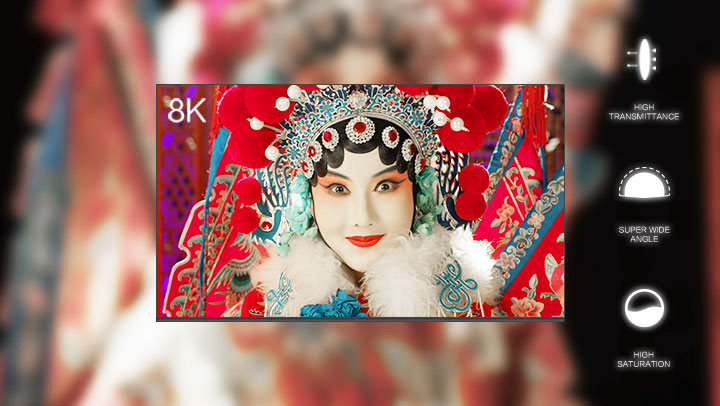 A resolution of 7680 x 4320, provides a wide viewing angle, high transmittance, high color saturation, fine details, and incomparable sense of telepresence.